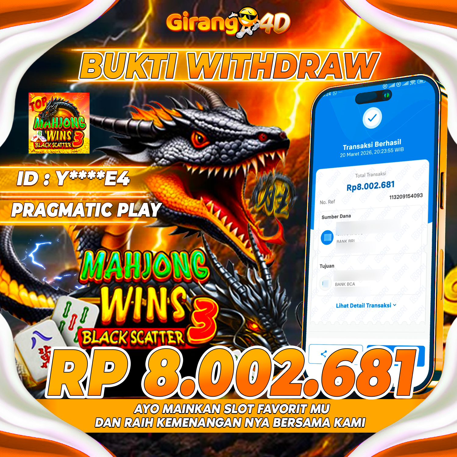 Selamat Kepada Id : Y****E4 Atas Withdraw Rp. 8.002.681 Hari ini. Ditunggu Withdraw Selanjutnya dan ajak juga teman temannya bergabung di GIRANG4D