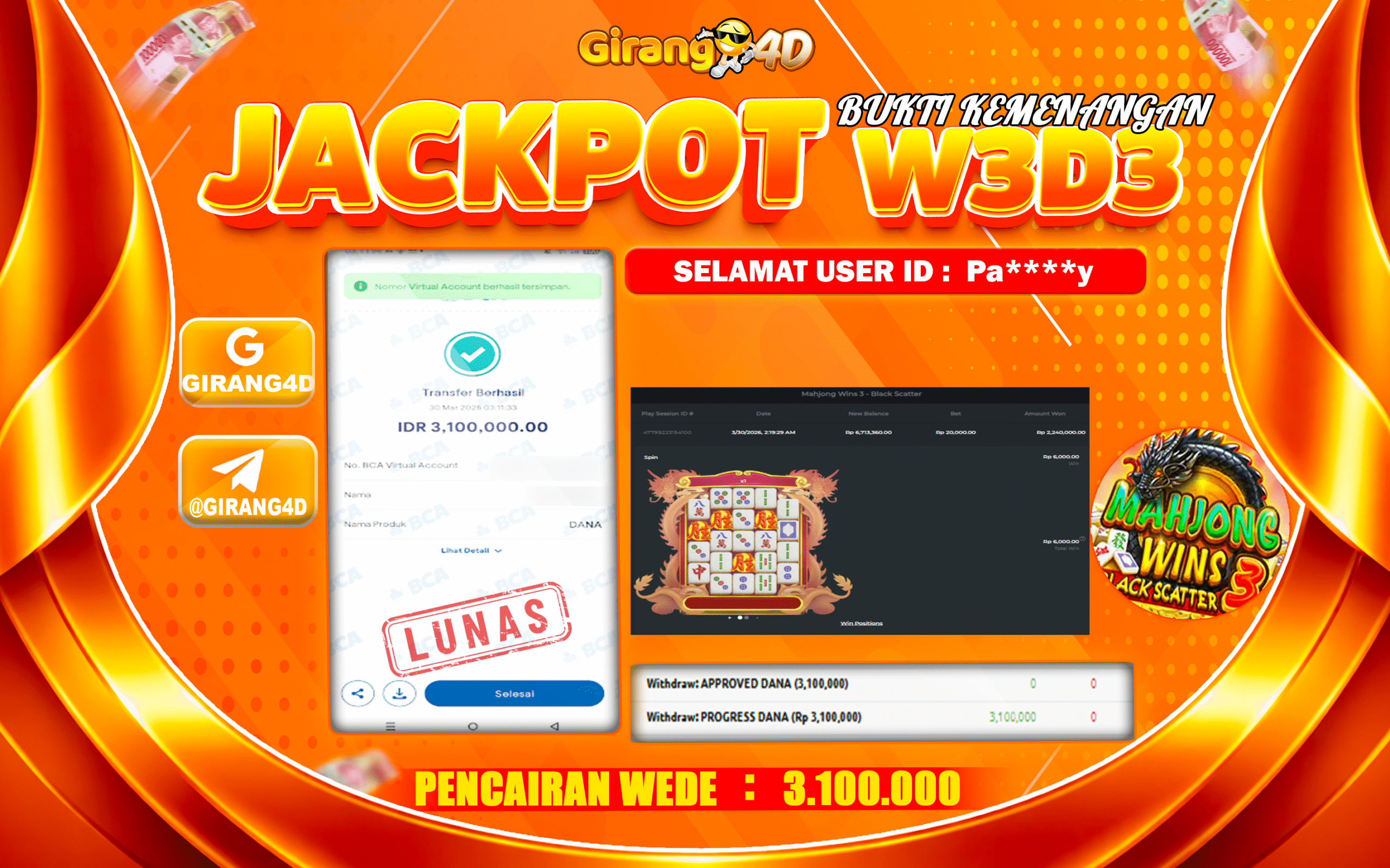 Selamat Kepada Id : Pa****y Atas Withdraw Rp. 3.100.000 Hari ini. Ditunggu Withdraw Selanjutnya dan ajak juga teman temannya bergabung di GIRANG4D
