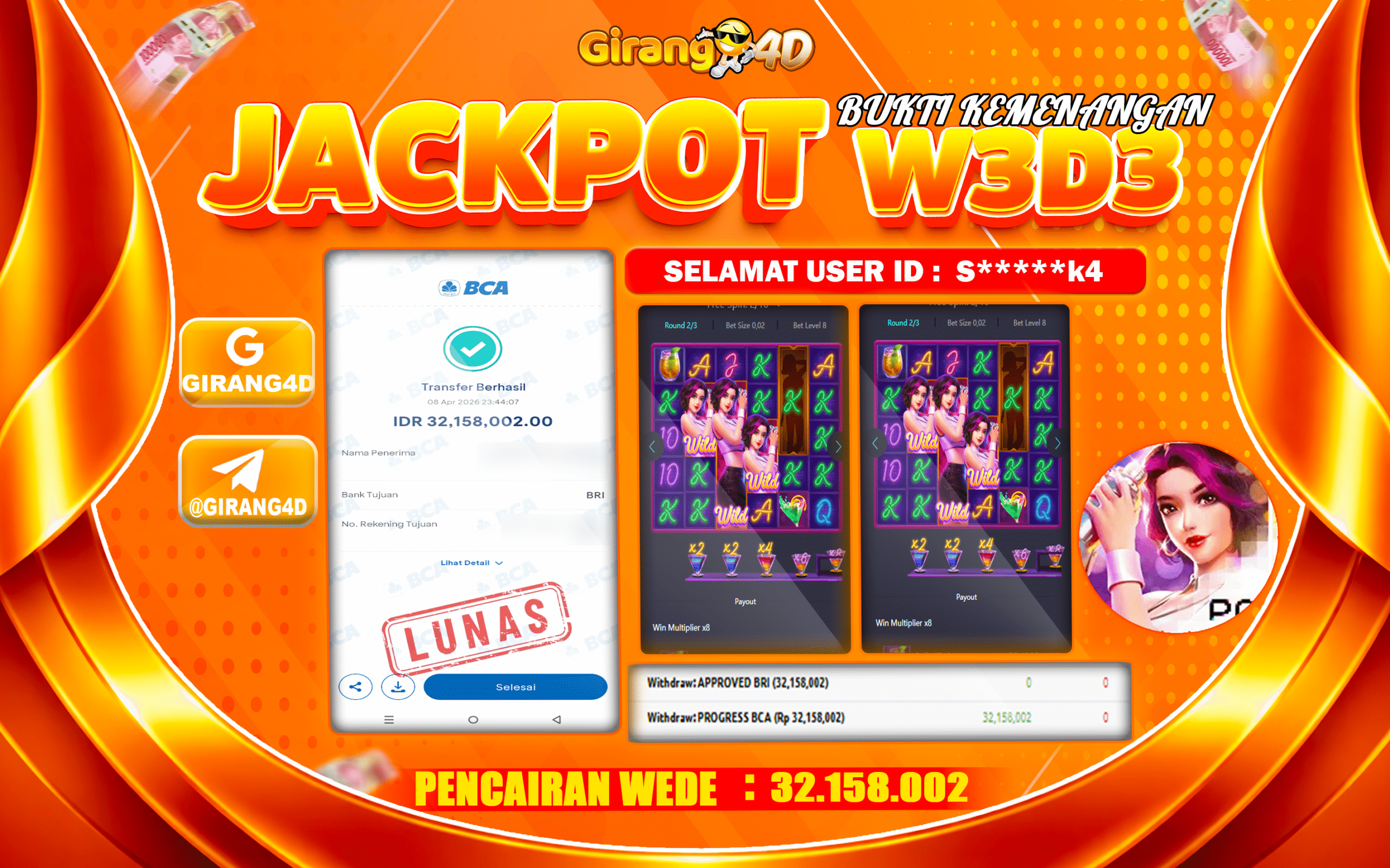 Selamat Kepada Id : S*****k4 Atas Withdraw Rp. 32.158.002 Hari ini. Ditunggu Withdraw Selanjutnya dan ajak juga teman temannya bergabung di GIRANG4D
