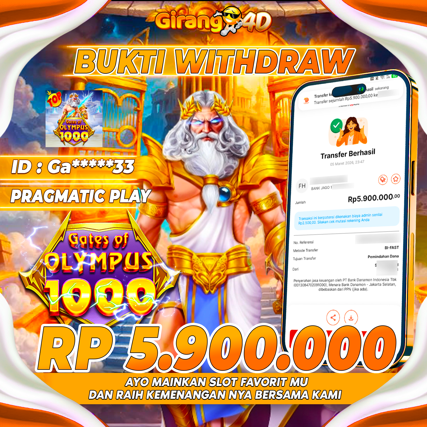 Selamat Kepada Id : GA****33 Atas Withdraw Rp. 5.900.000 Hari ini. Ditunggu Withdraw Selanjutnya dan ajak juga teman temannya bergabung di GIRANG4D