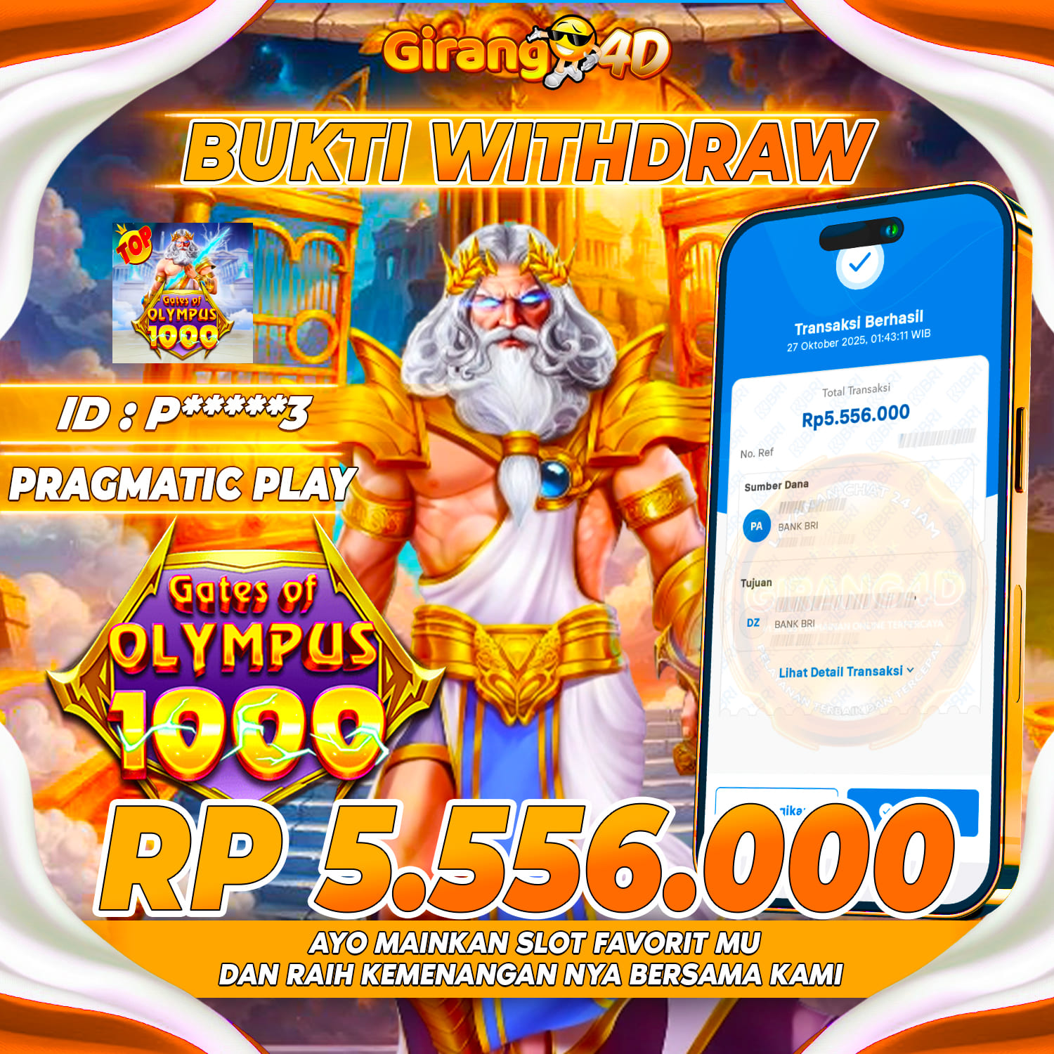 Selamat Kepada Id : P******3 Atas Withdraw Rp. 5.556.000 Juta Hari ini. Ditunggu Withdraw Selanjutnya dan ajak juga teman temannya bergabung di GIRANG4D