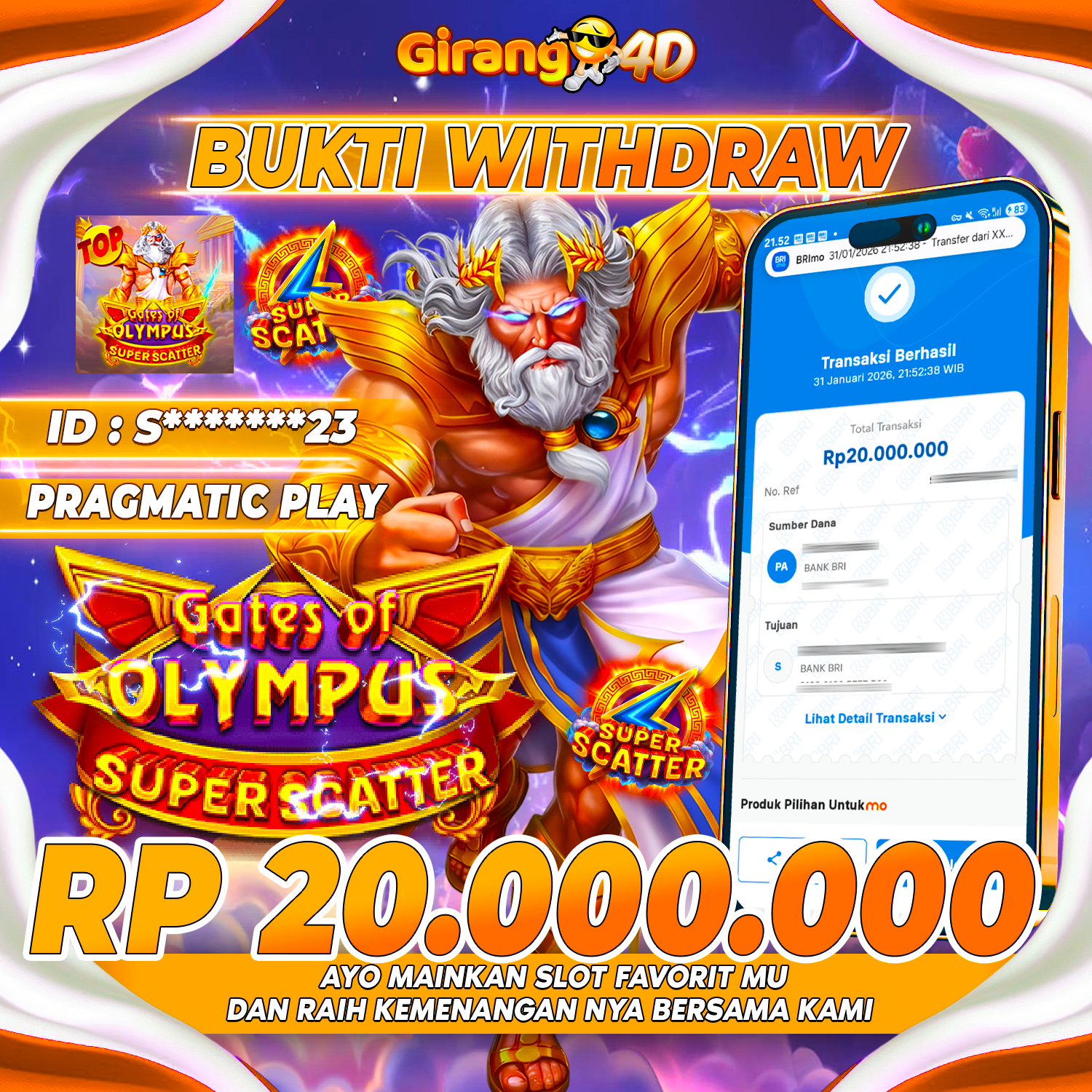 Selamat Kepada Id : S******23 Atas Withdraw Rp. 20.000.000 Hari ini. Ditunggu Withdraw Selanjutnya dan ajak juga teman temannya bergabung di GIRANG4D