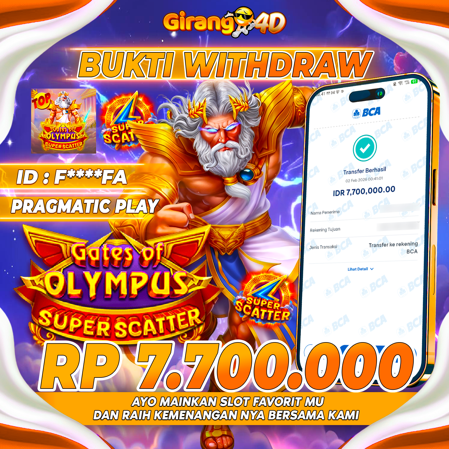 Selamat Kepada Id : F****FA Atas Withdraw Rp. 7.700.000 Hari ini. Ditunggu Withdraw Selanjutnya dan ajak juga teman temannya bergabung di GIRANG4D