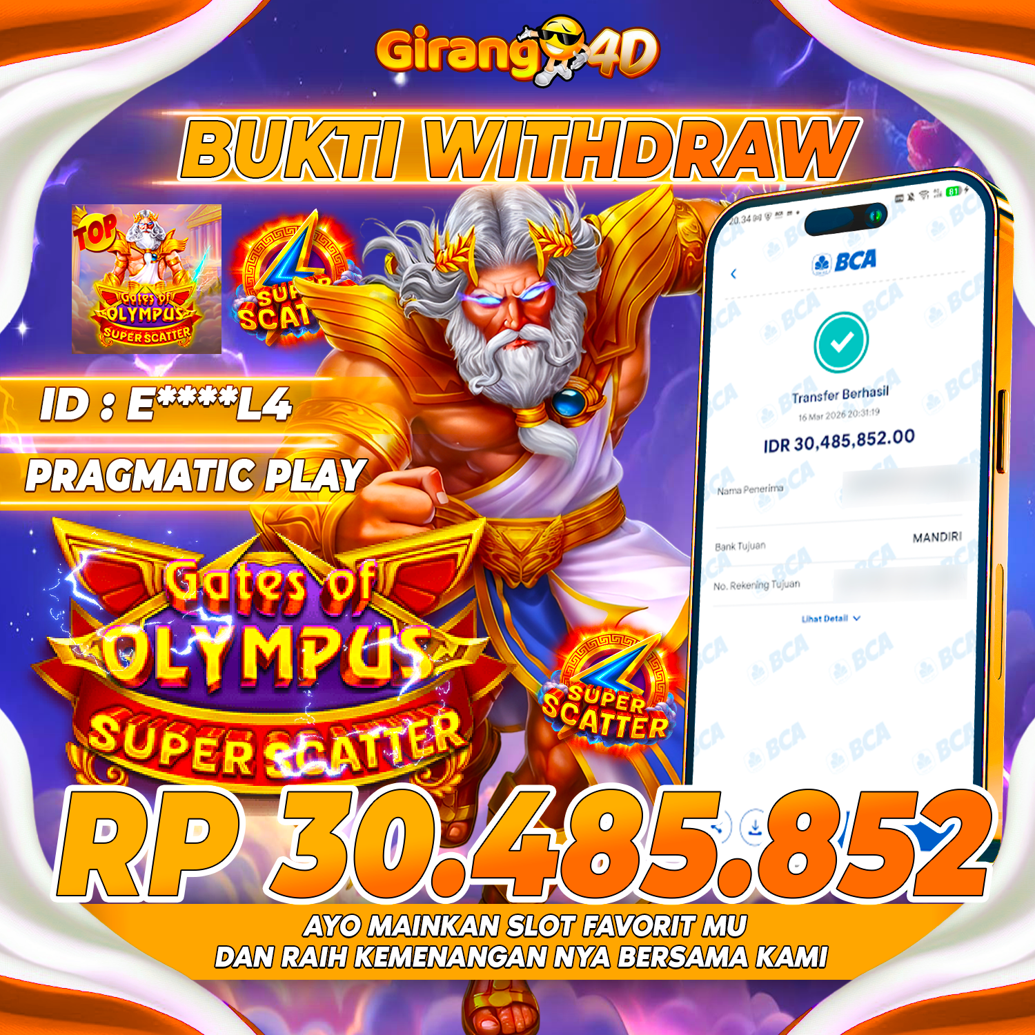 Selamat Kepada Id : E****L4 Atas Withdraw Rp. 30.485.852 Hari ini. Ditunggu Withdraw Selanjutnya dan ajak juga teman temannya bergabung di GIRANG4D