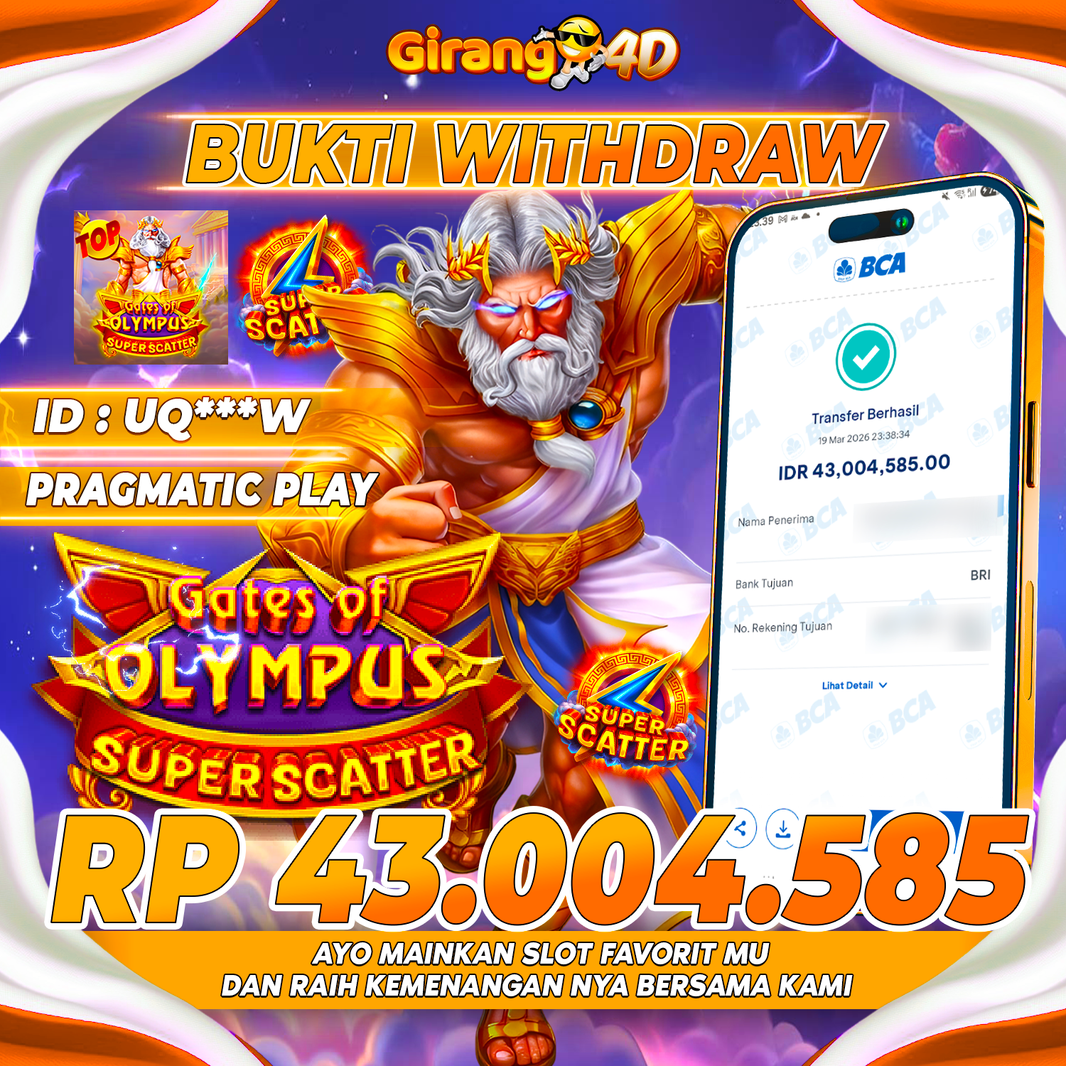 Selamat Kepada Id : UQ***W Atas Withdraw Rp. 43.004.585 Hari ini. Ditunggu Withdraw Selanjutnya dan ajak juga teman temannya bergabung di GIRANG4D