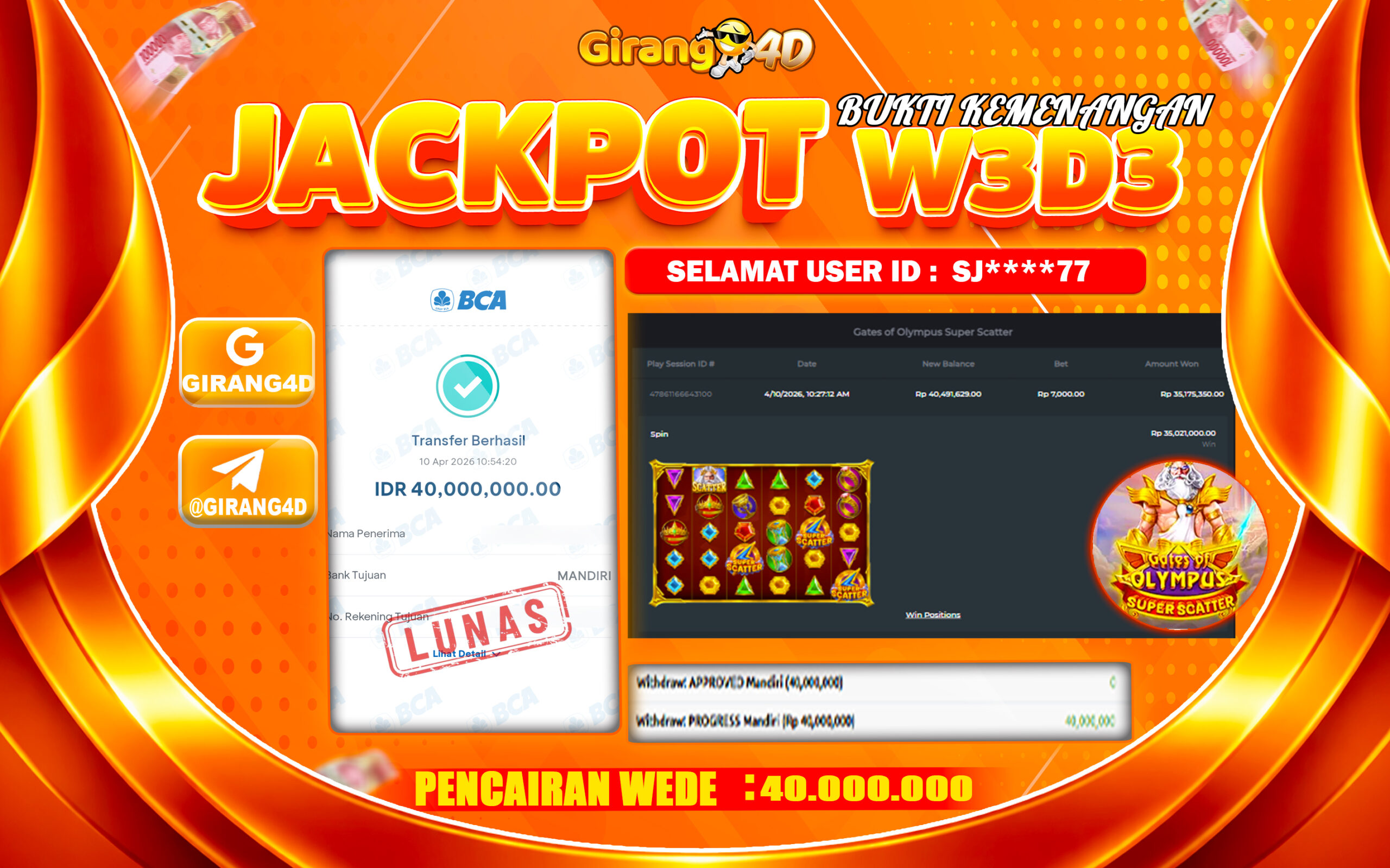 Selamat Kepada Id : SJ*****77 Atas Withdraw Rp. 40.000.000 Hari ini. Ditunggu Withdraw Selanjutnya dan ajak juga teman temannya bergabung di GIRANG4D