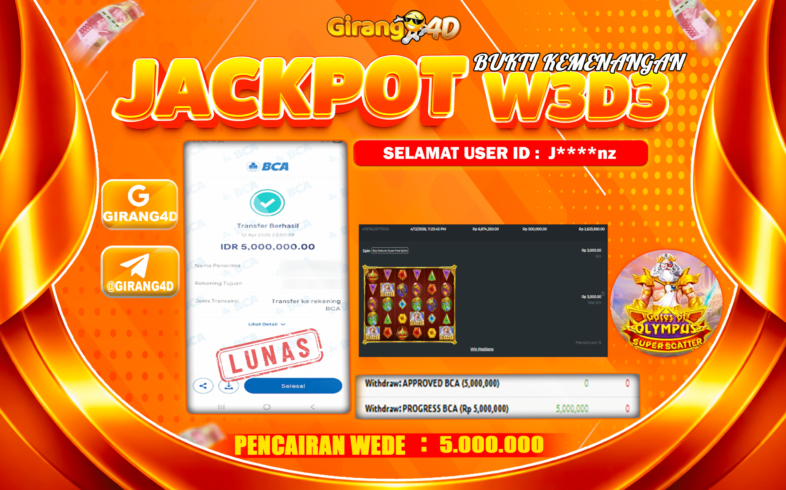 Selamat Kepada Id : J***nz Atas Withdraw Rp. 5.000.000 Hari ini. Ditunggu Withdraw Selanjutnya dan ajak juga teman temannya bergabung di GIRANG4D