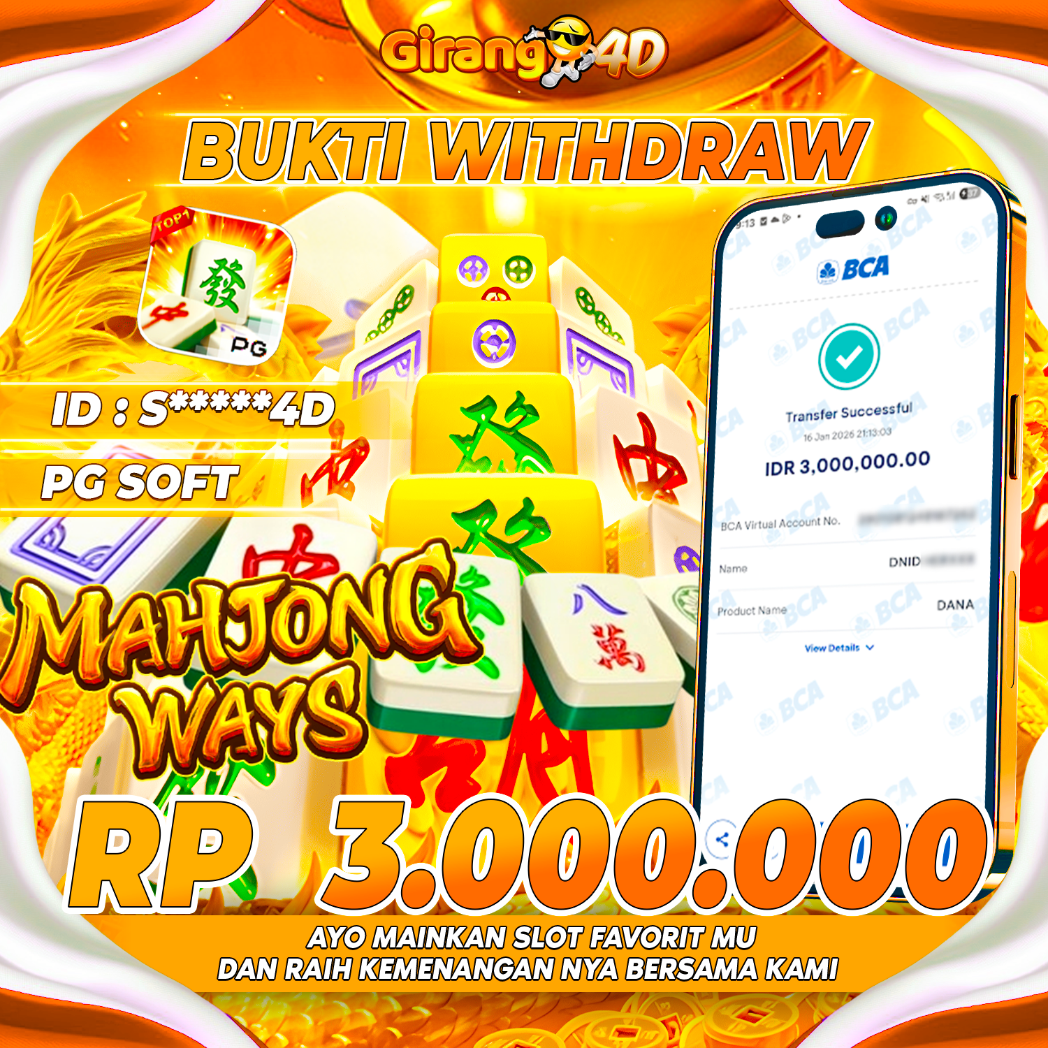 Selamat Kepada Id : S*****4D Atas Withdraw Rp. 3.000.000 Hari ini. Ditunggu Withdraw Selanjutnya dan ajak juga teman temannya bergabung di GIRANG4D