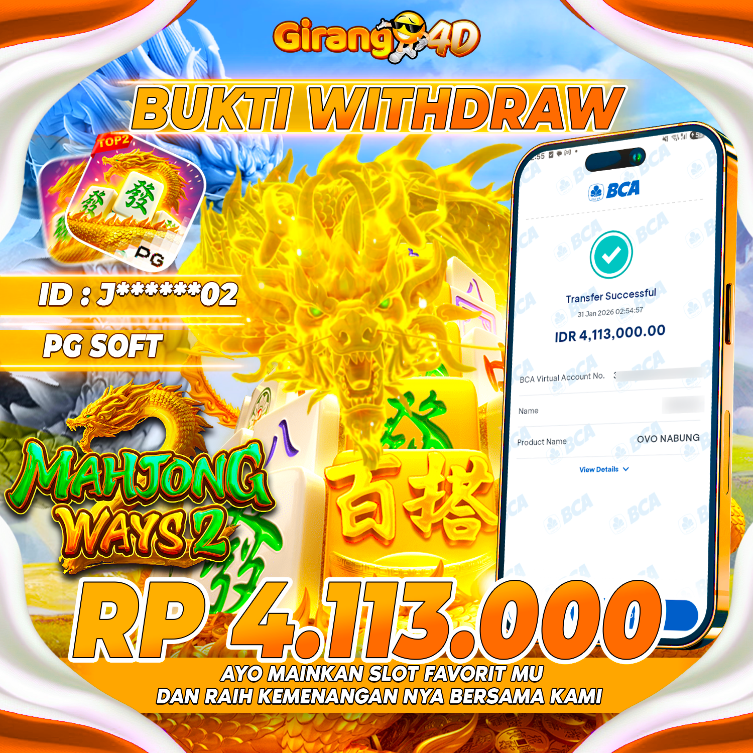 Selamat Kepada Id : J*****02 Atas Withdraw Rp. 4,113,000 Hari ini. Ditunggu Withdraw Selanjutnya dan ajak juga teman temannya bergabung di GIRANG4D