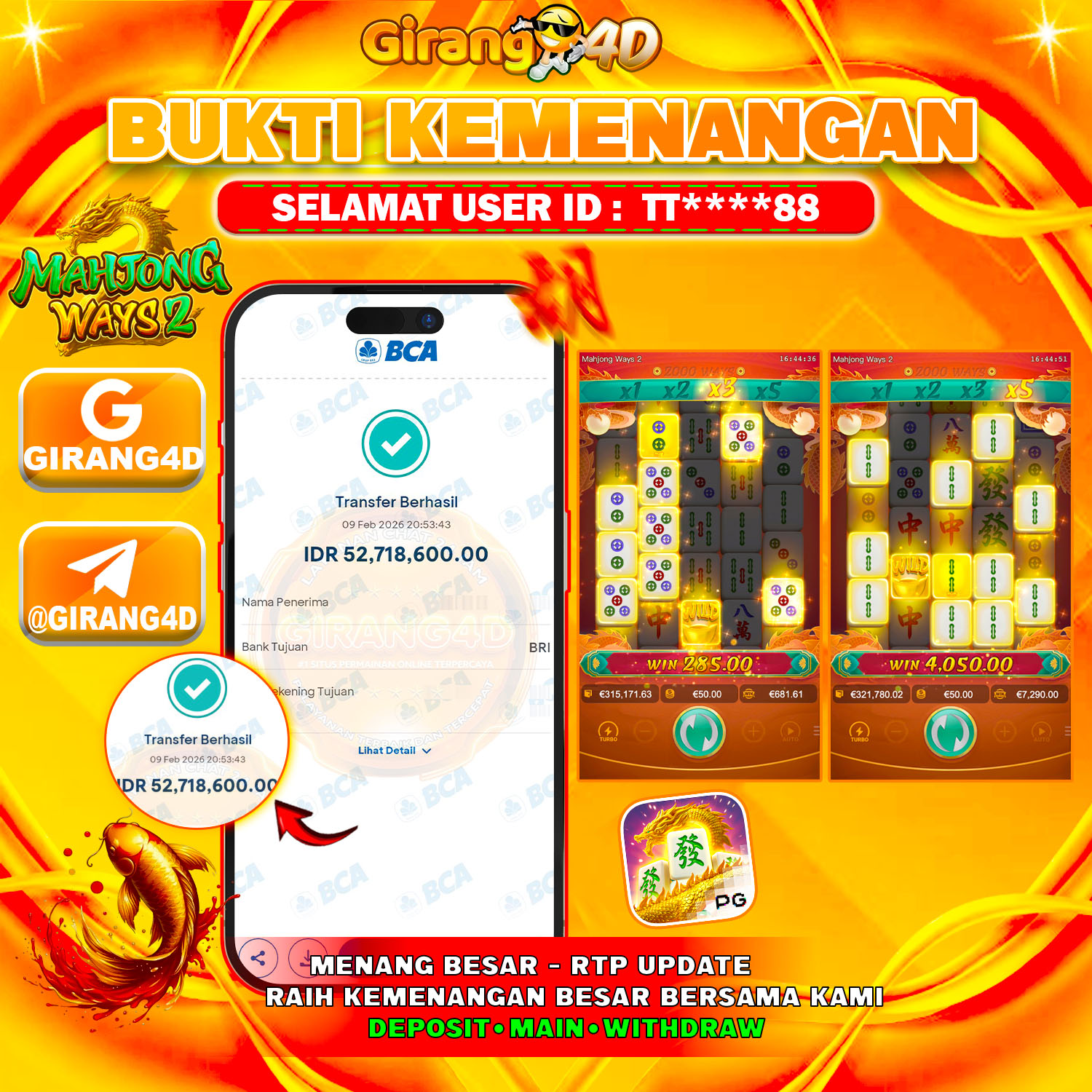 Selamat Kepada Id : TT****88 Atas Withdraw Rp. 52.718.600 Hari ini. Ditunggu Withdraw Selanjutnya dan ajak juga teman temannya bergabung di GIRANG4D