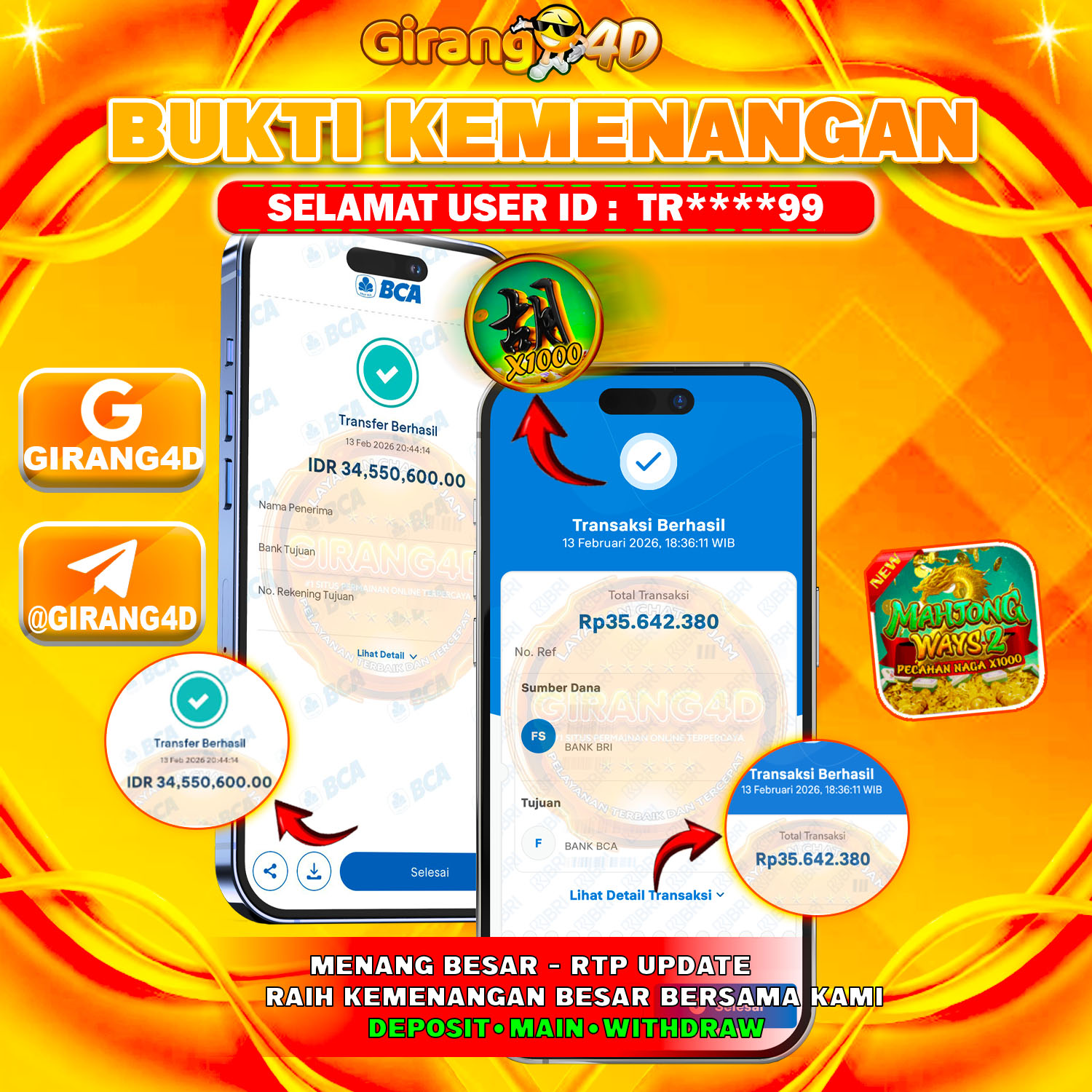 Selamat Kepada Id :TR****99 Atas Withdraw Rp. 35.642.380 Hari ini. Ditunggu Withdraw Selanjutnya dan ajak juga teman temannya bergabung di GIRANG4D