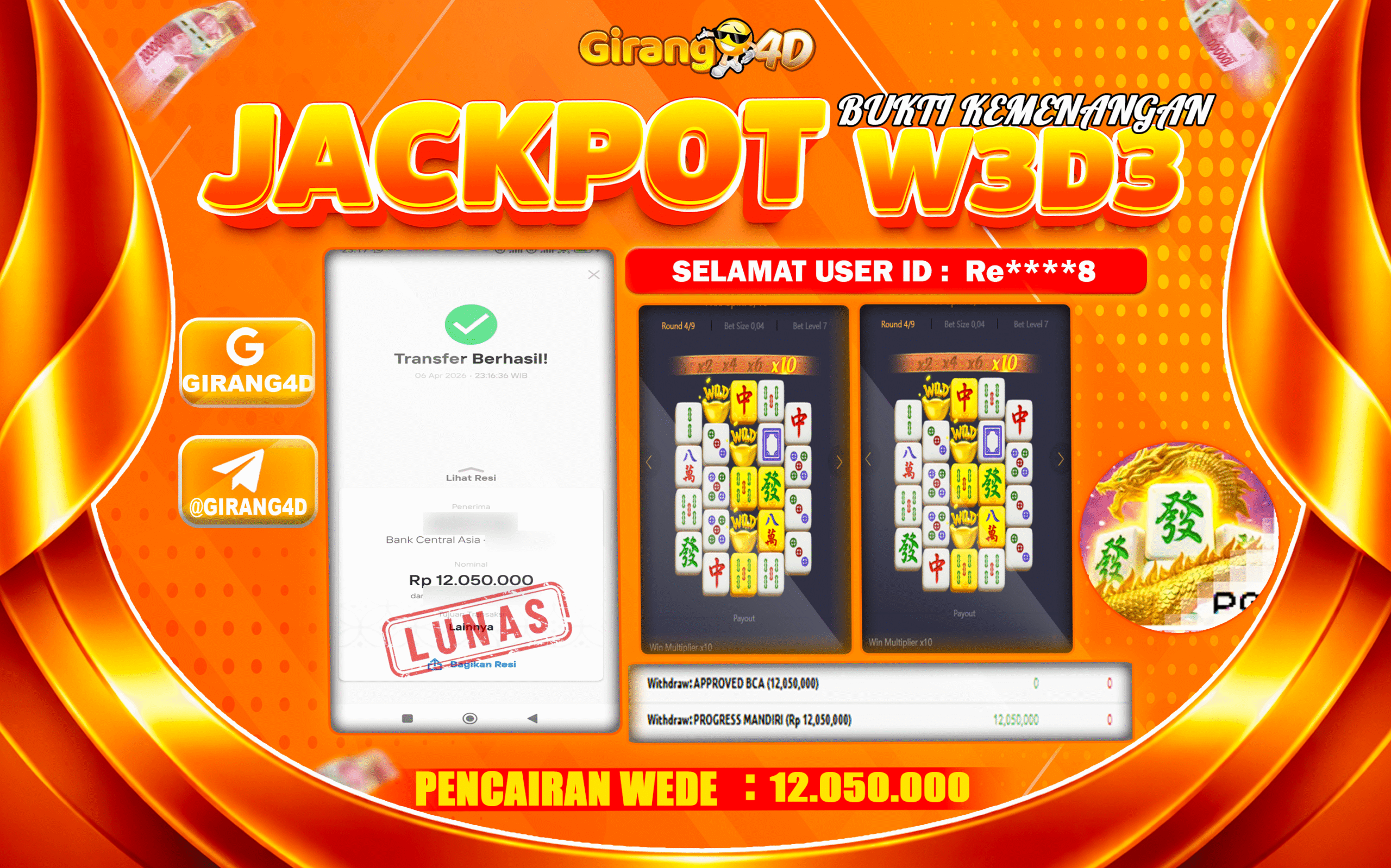 Selamat Kepada Id : Re****8 Atas Withdraw Rp. 12.050.000 Hari ini. Ditunggu Withdraw Selanjutnya dan ajak juga teman temannya bergabung di GIRANG4D