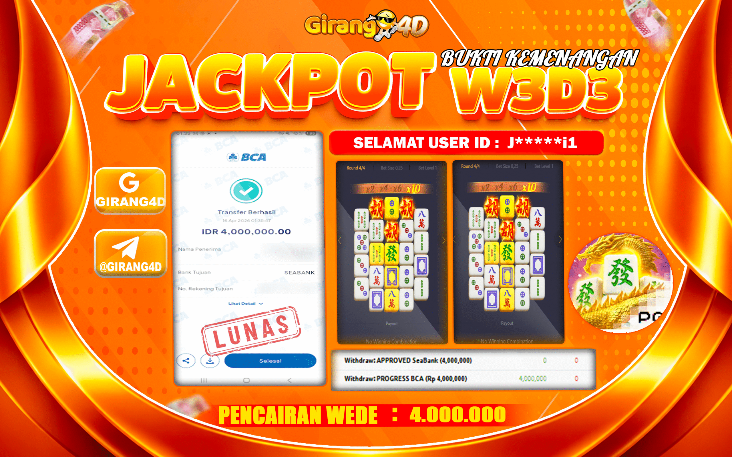 Selamat Kepada Id : J****i2 Atas Withdraw Rp. 4.000.000 Hari ini. Ditunggu Withdraw Selanjutnya dan ajak juga teman temannya bergabung di GIRANG4D