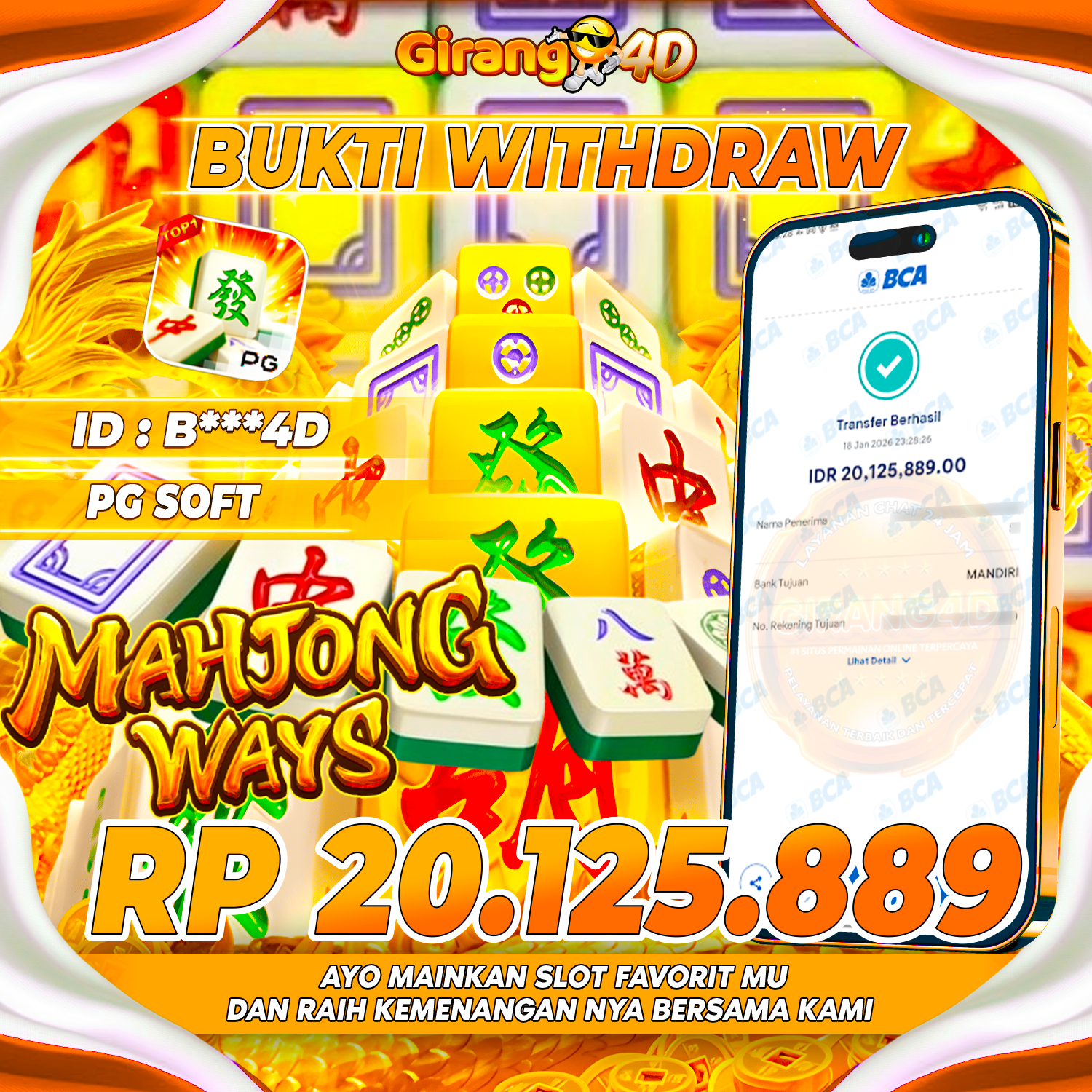 Selamat Kepada Id : B***4D Atas Withdraw Rp.20.125.889 Hari ini. Ditunggu Withdraw Selanjutnya dan ajak juga teman temannya bergabung di GIRANG4D