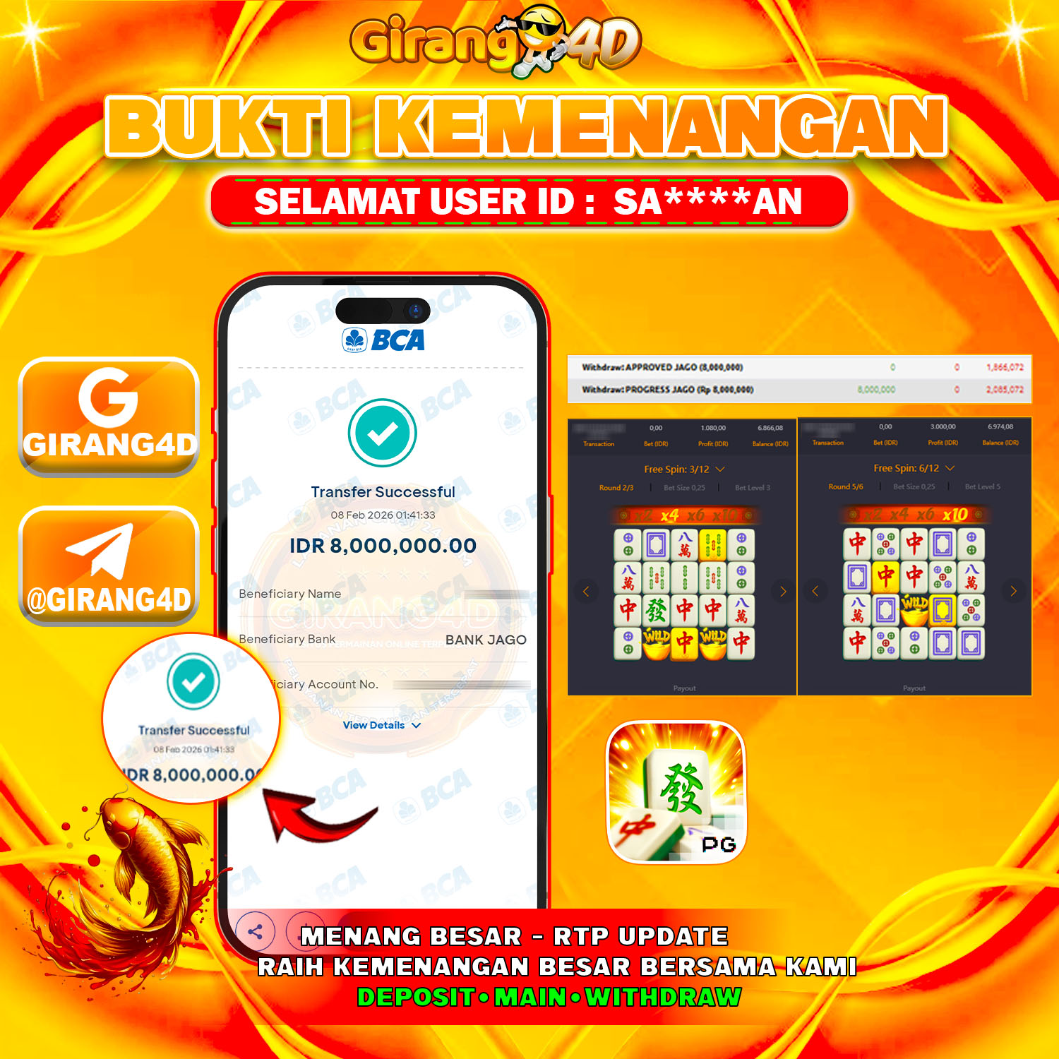 Selamat Kepada Id : SA****AN Atas Withdraw Rp. 8.000.000 Hari ini. Ditunggu Withdraw Selanjutnya dan ajak juga teman temannya bergabung di GIRANG4D