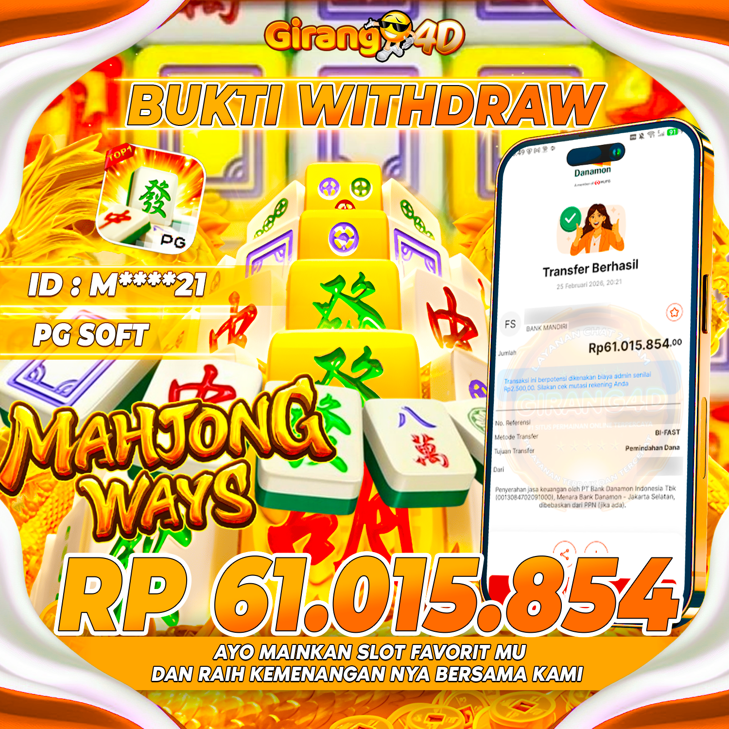 Selamat Kepada Id : M****21 Atas Withdraw Rp. 61.015.854 Hari ini. Ditunggu Withdraw Selanjutnya dan ajak juga teman temannya bergabung di GIRANG4D