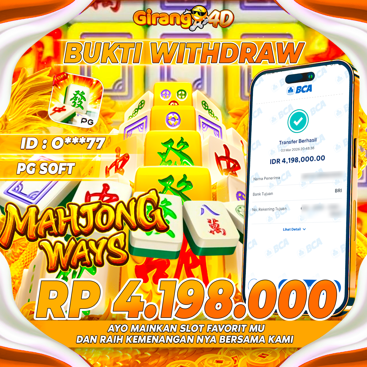 Selamat Kepada Id : O***77 Atas Withdraw Rp. 4.198.000 Hari ini. Ditunggu Withdraw Selanjutnya dan ajak juga teman temannya bergabung di GIRANG4D