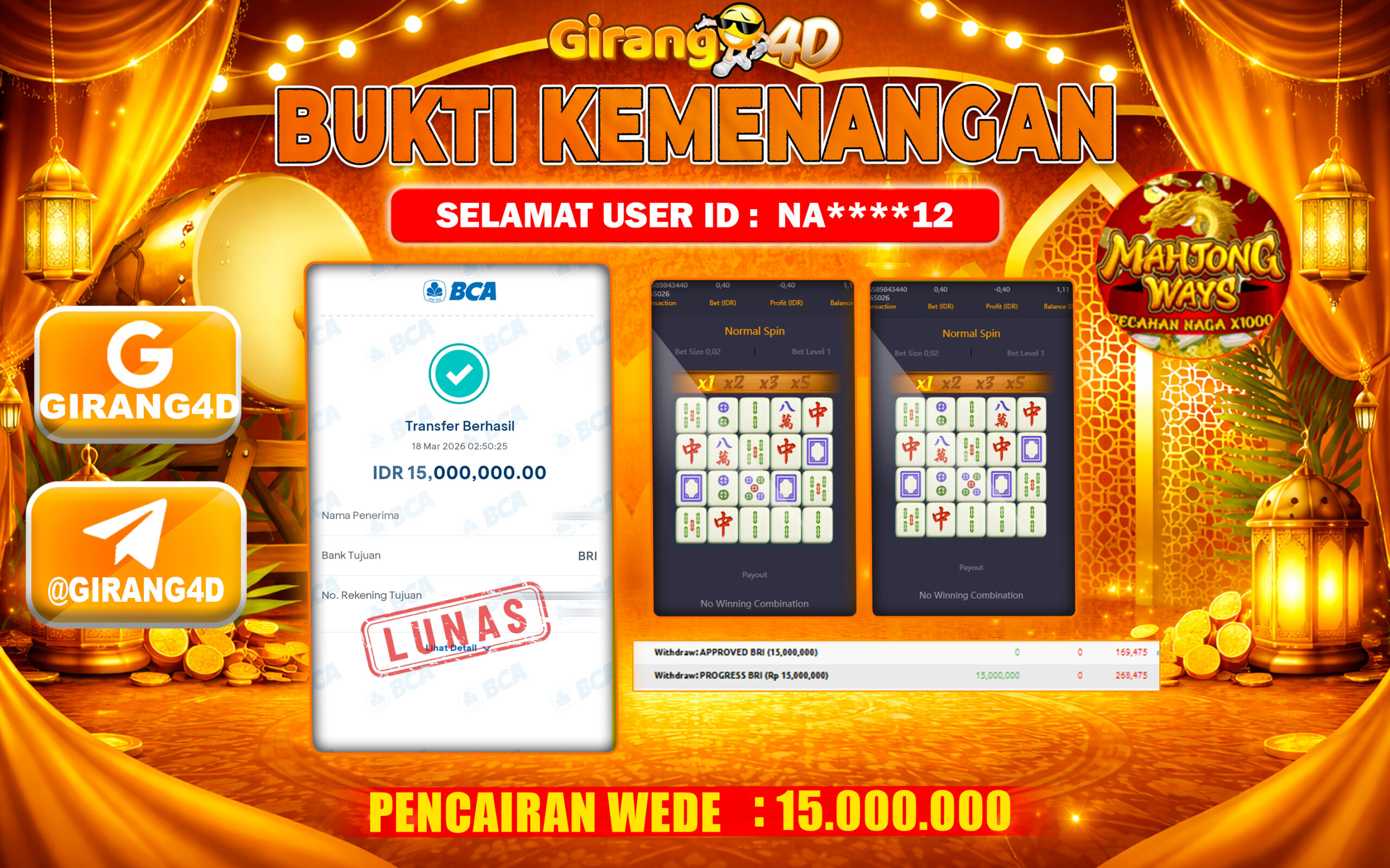 Selamat Kepada Id : NA*****12 Atas Withdraw Rp. 15.000.000Hari ini. Ditunggu Withdraw Selanjutnya dan ajak juga teman temannya bergabung di GIRANG4D