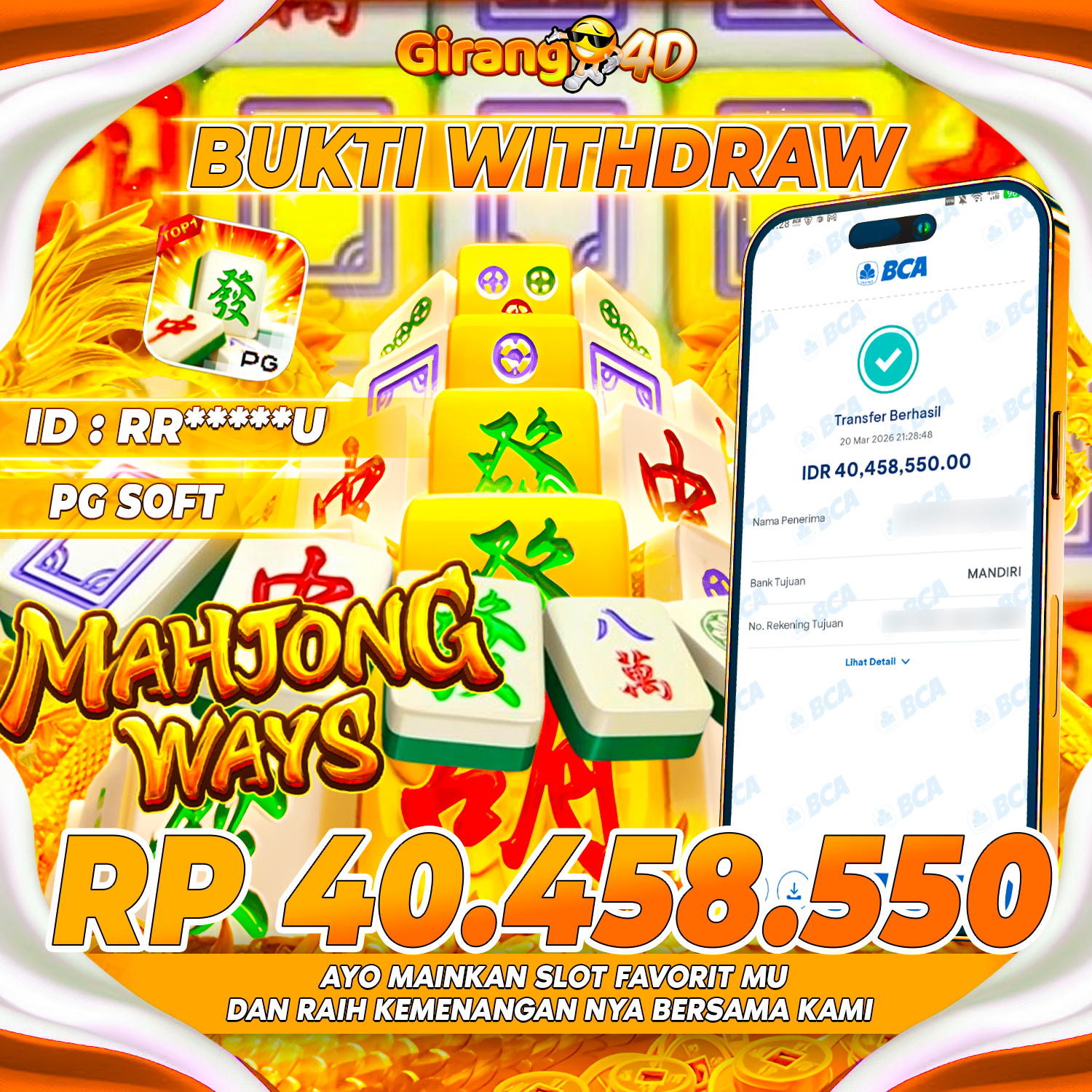 Selamat Kepada Id : RR*****U Atas Withdraw Rp. 40.458.550 Hari ini. Ditunggu Withdraw Selanjutnya dan ajak juga teman temannya bergabung di GIRANG4D