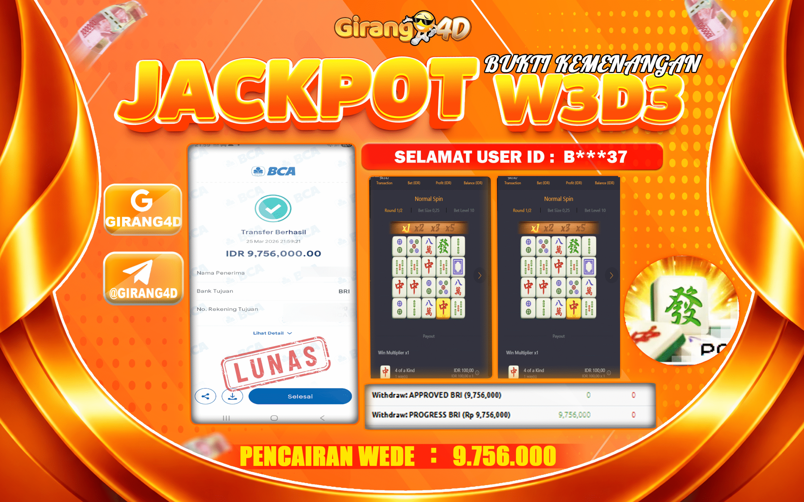 Selamat Kepada Id : B***37 Atas Withdraw Rp. 9.756.000 Hari ini. Ditunggu Withdraw Selanjutnya dan ajak juga teman temannya bergabung di GIRANG4D