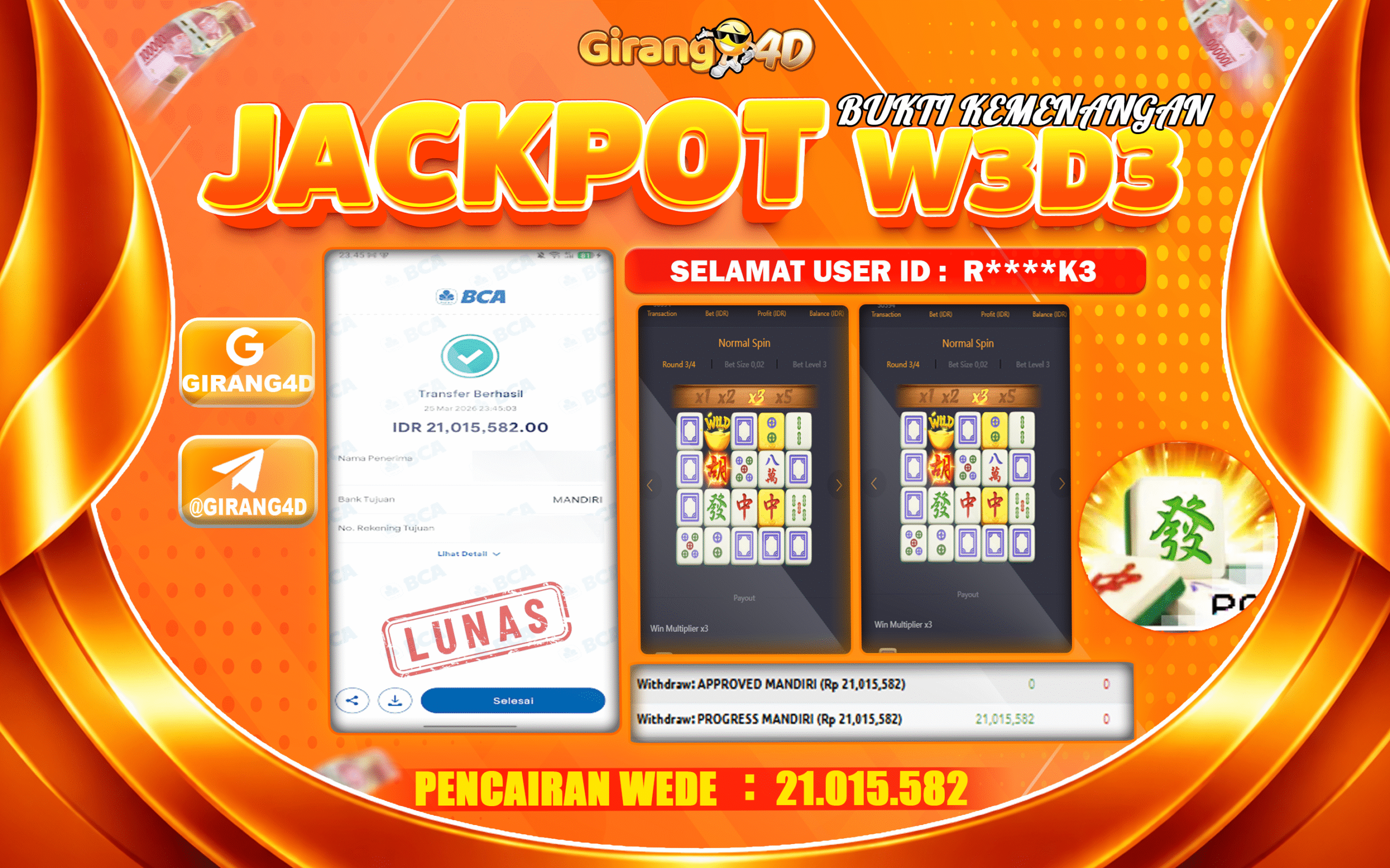 Selamat Kepada Id : R****37 Atas Withdraw Rp. 21.015.582 Hari ini. Ditunggu Withdraw Selanjutnya dan ajak juga teman temannya bergabung di GIRANG4D