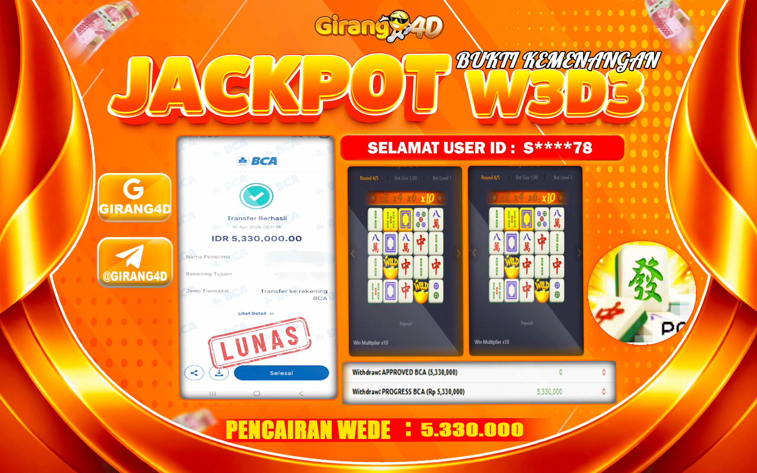 Selamat Kepada Id : S****78 Atas Withdraw Rp. 5.330.000 Hari ini. Ditunggu Withdraw Selanjutnya dan ajak juga teman temannya bergabung di GIRANG4D