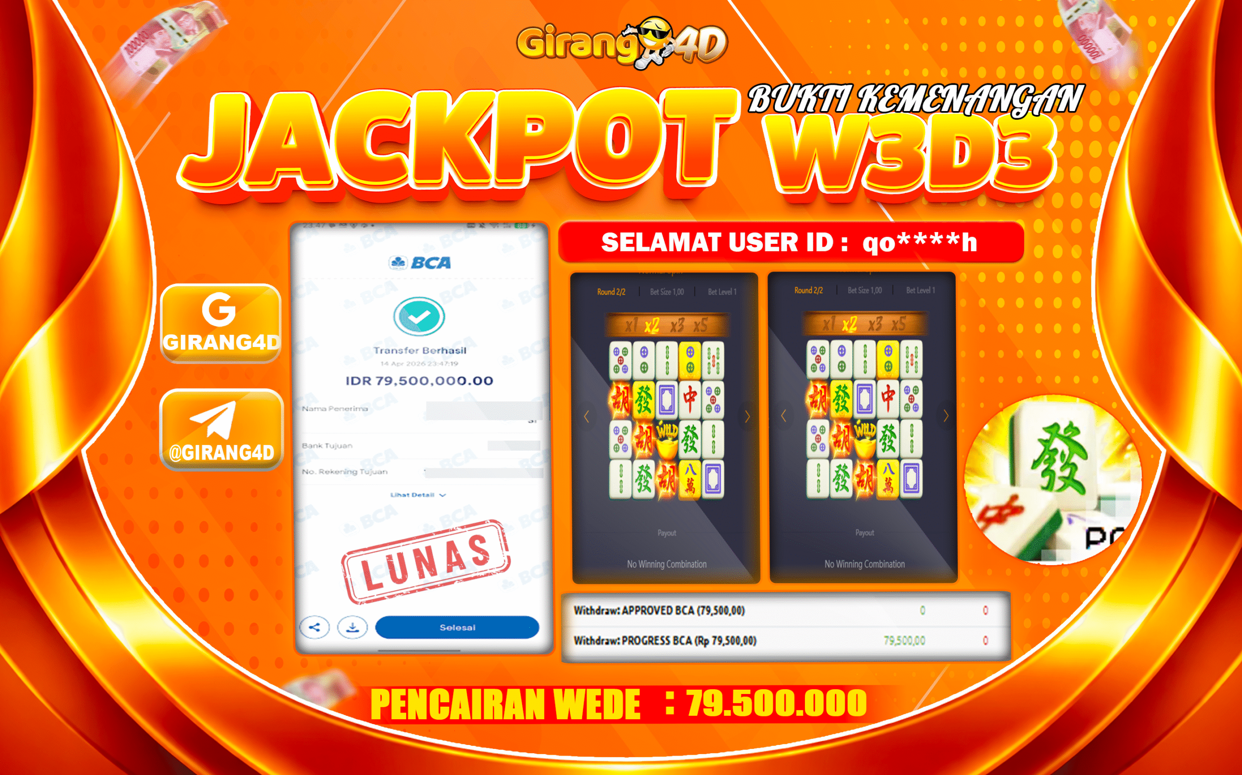 Selamat Kepada Id : qo****h Atas Withdraw Rp. 79.500.000 Hari ini. Ditunggu Withdraw Selanjutnya dan ajak juga teman temannya bergabung di GIRANG4D