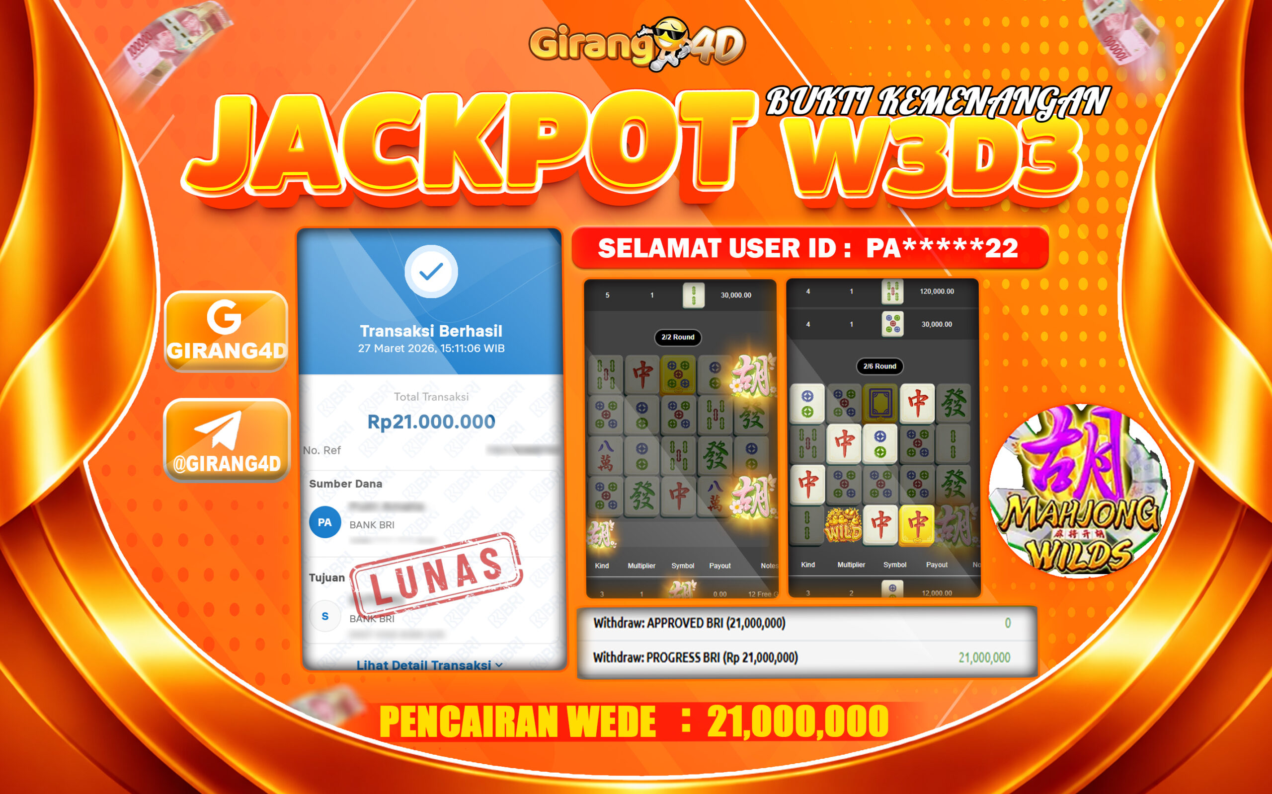Selamat Kepada Id : PA****22 Atas Withdraw Rp. 21.000.000 Hari ini. Ditunggu Withdraw Selanjutnya dan ajak juga teman temannya bergabung di GIRANG4D