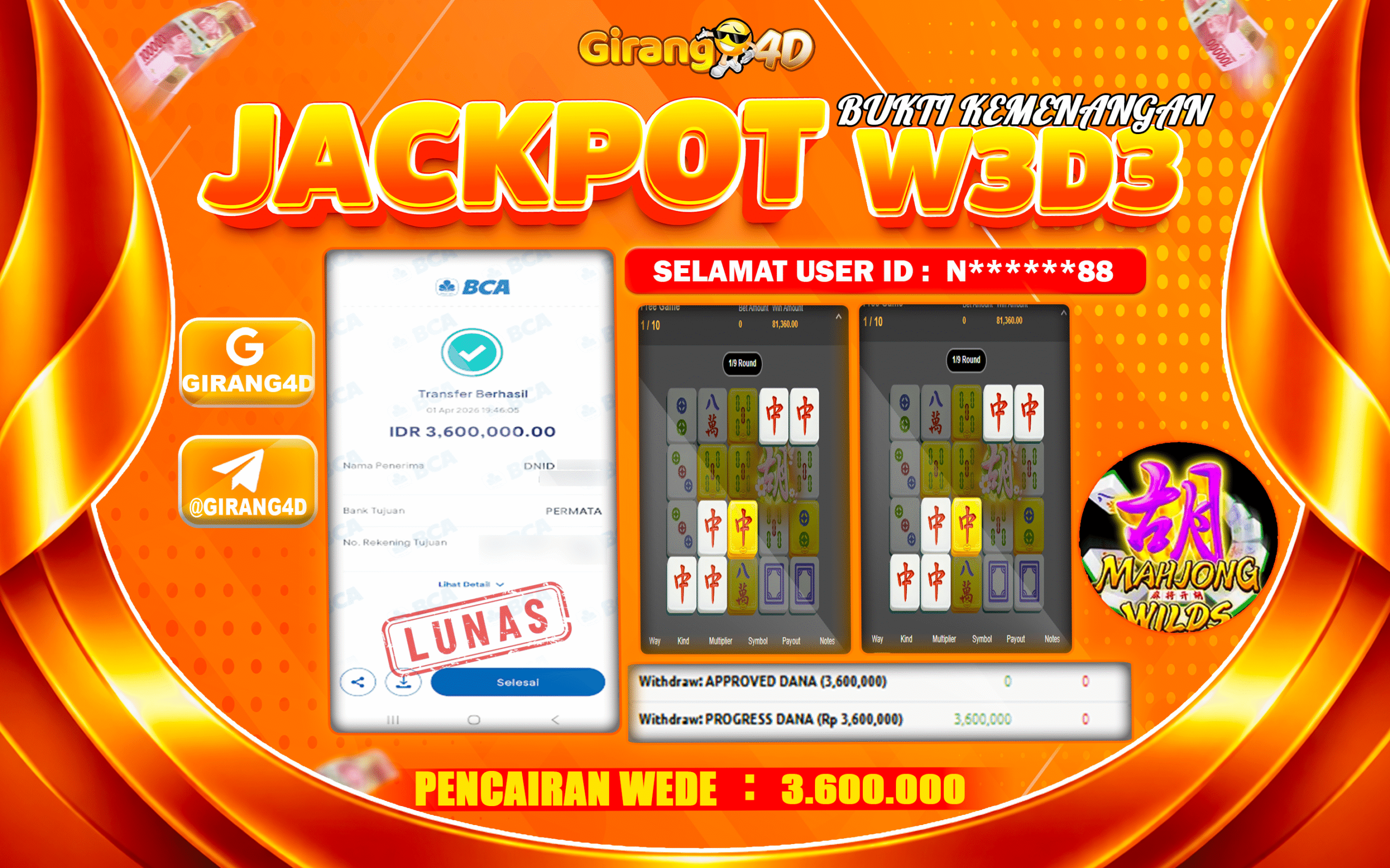 Selamat Kepada Id : N******88Atas Withdraw Rp. 3.600.000 Hari ini. Ditunggu Withdraw Selanjutnya dan ajak juga teman temannya bergabung di GIRANG4D