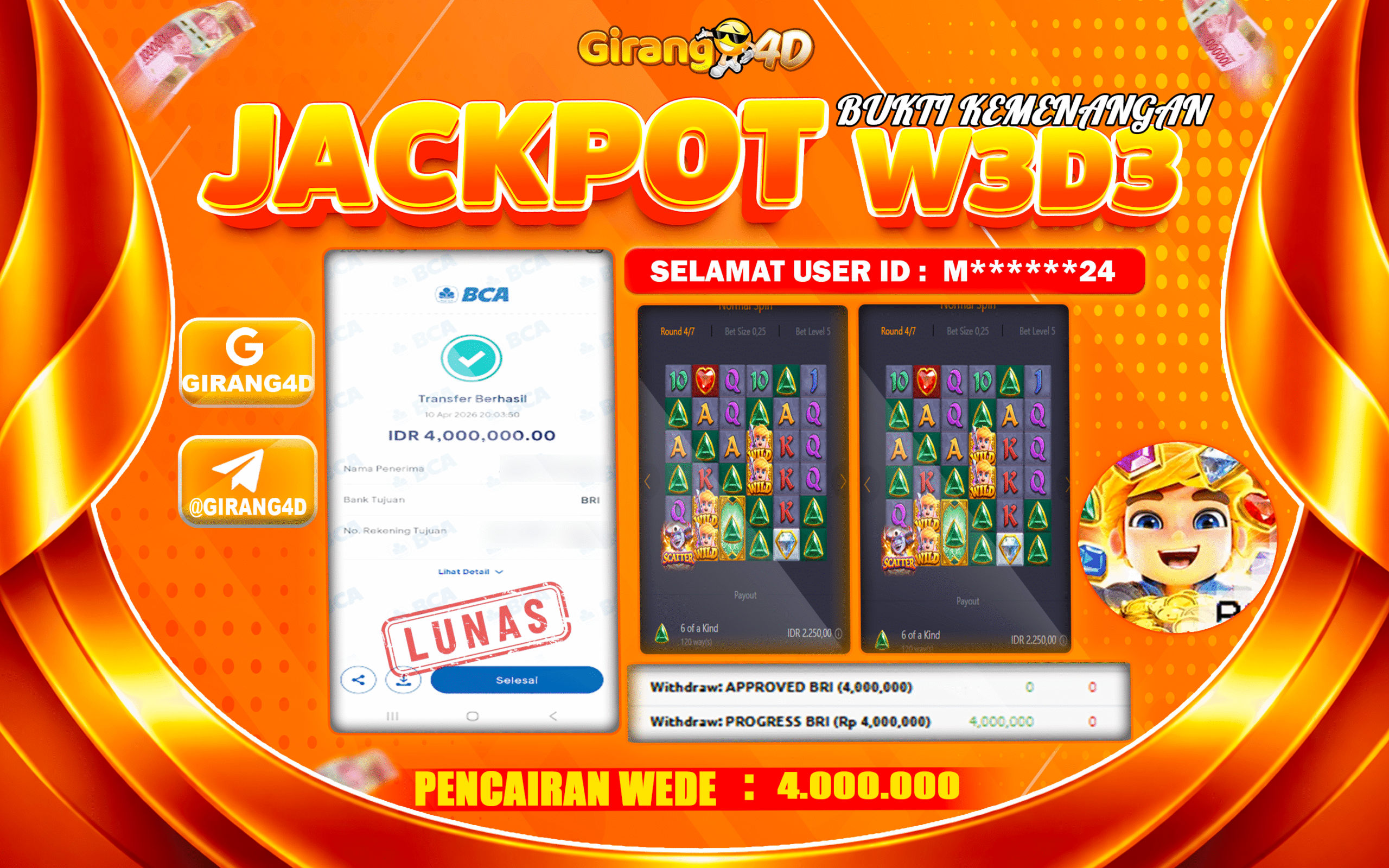 Selamat Kepada Id : M******24 Atas Withdraw Rp. 4.000.000 Hari ini. Ditunggu Withdraw Selanjutnya dan ajak juga teman temannya bergabung di GIRANG4D