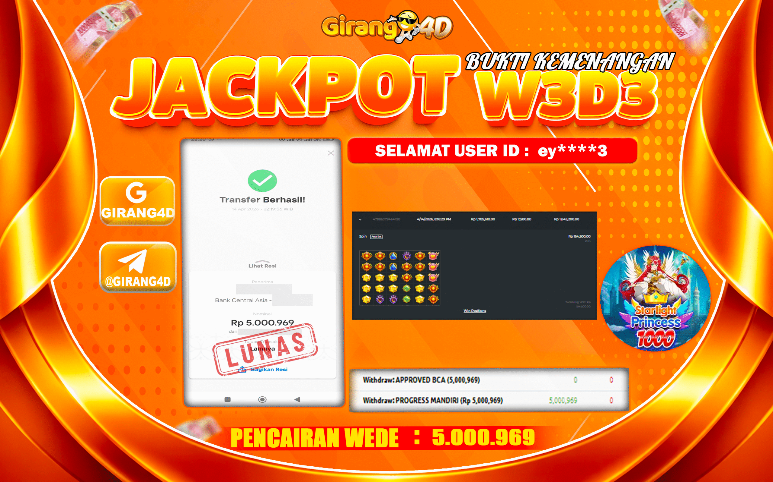 Selamat Kepada Id : ey****3 Atas Withdraw Rp. 5.000.969 Hari ini. Ditunggu Withdraw Selanjutnya dan ajak juga teman temannya bergabung di GIRANG4D