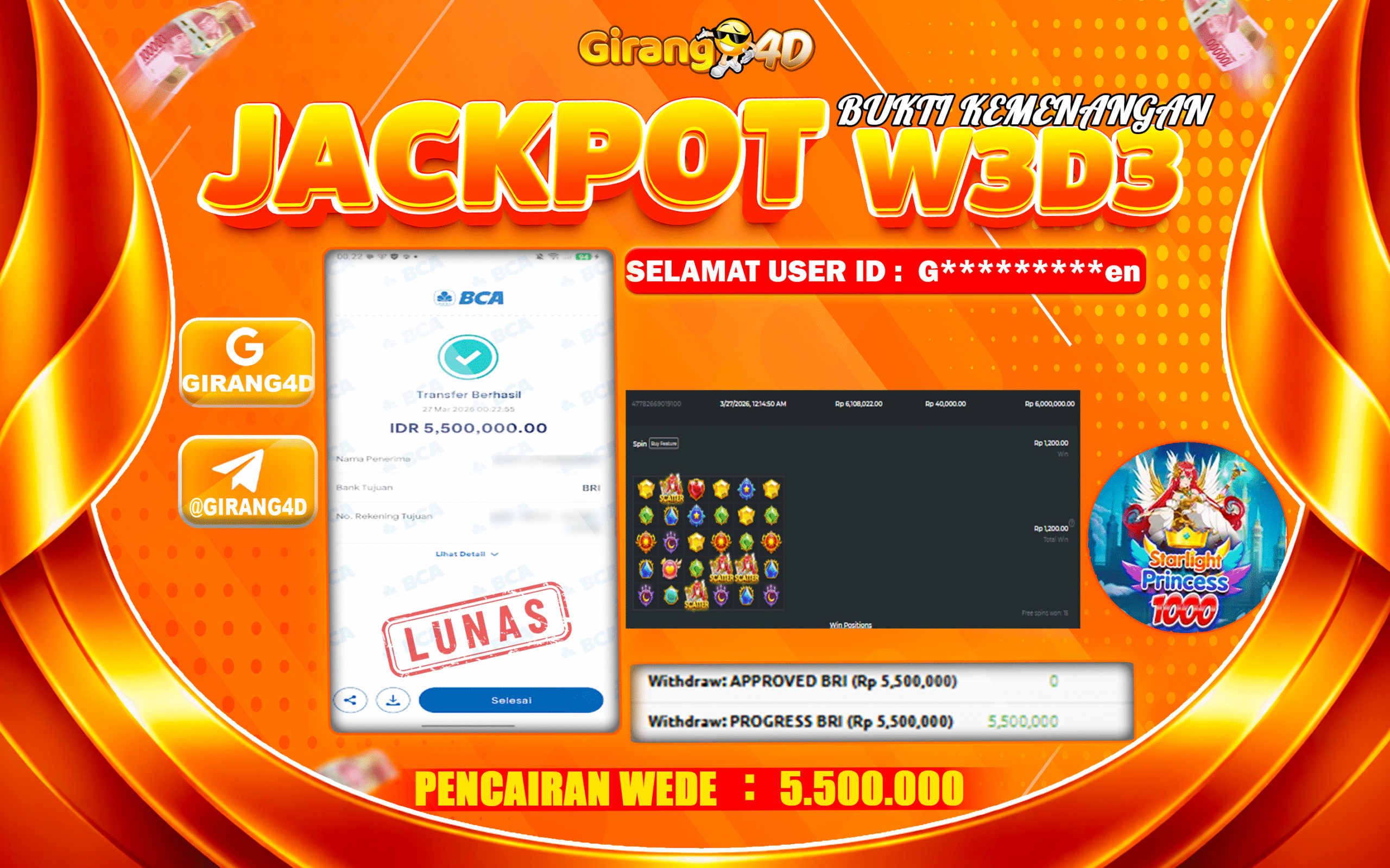 Selamat Kepada Id : G*******en Atas Withdraw Rp. 5.500.00 Hari ini. Ditunggu Withdraw Selanjutnya dan ajak juga teman temannya bergabung di GIRANG4D