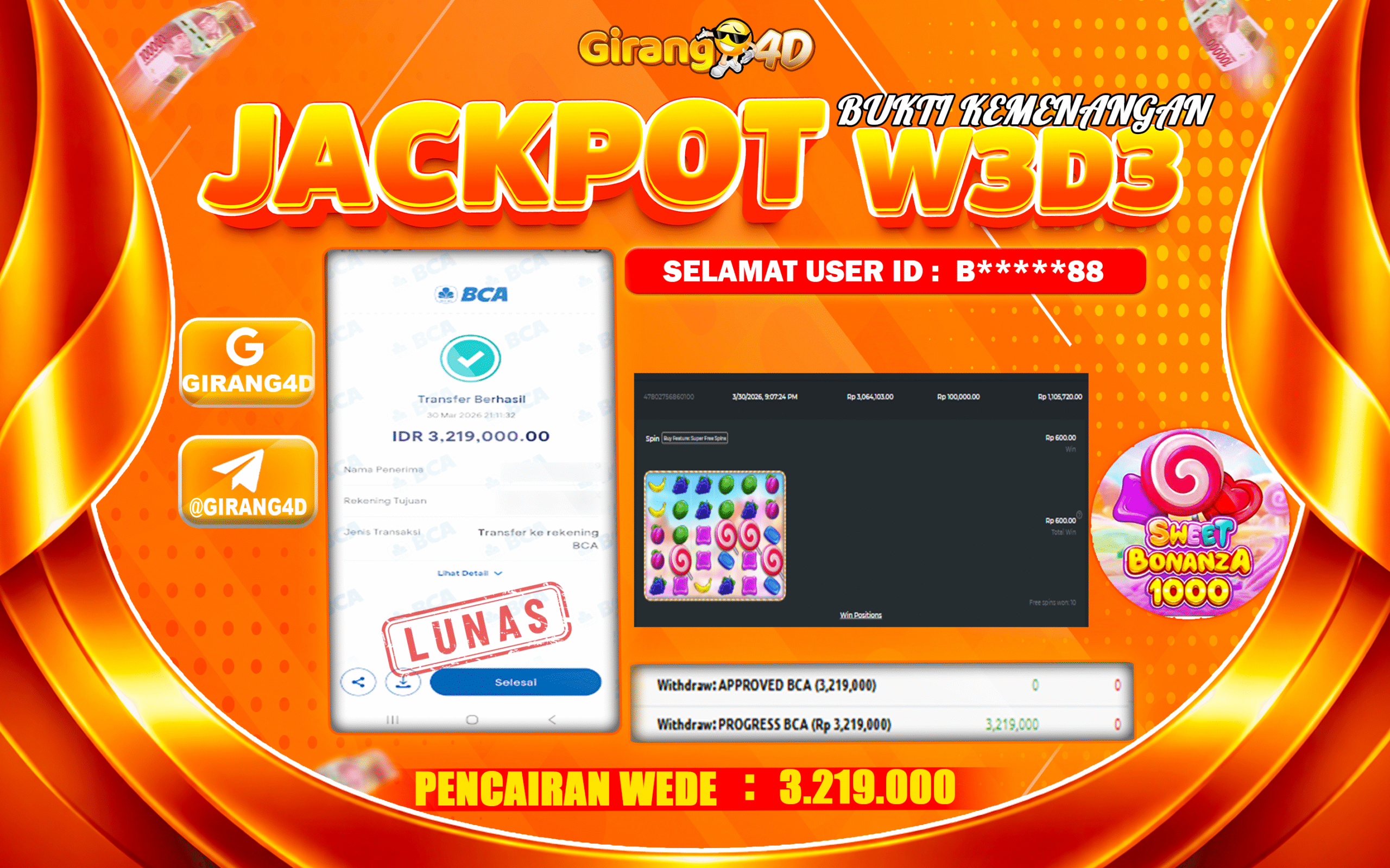 Selamat Kepada Id : B****88 Atas Withdraw Rp. 3.219.000 Hari ini. Ditunggu Withdraw Selanjutnya dan ajak juga teman temannya bergabung di GIRANG4D