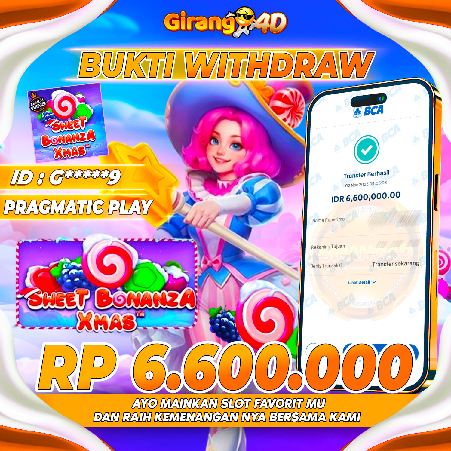 Selamat Kepada Id : G*****9 Atas Withdraw Rp. 6.600.000 Juta Hari ini. Ditunggu Withdraw Selanjutnya dan ajak juga teman temannya bergabung di GIRANG4D