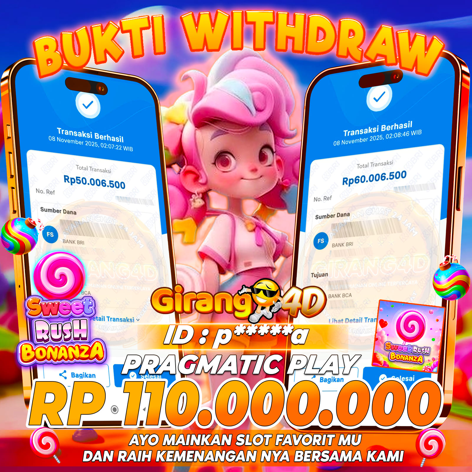 Selamat Kepada Id : p******a Atas Withdraw Rp. 110.000.000 Juta Hari ini. Ditunggu Withdraw Selanjutnya dan ajak juga teman temannya bergabung di GIRANG4D