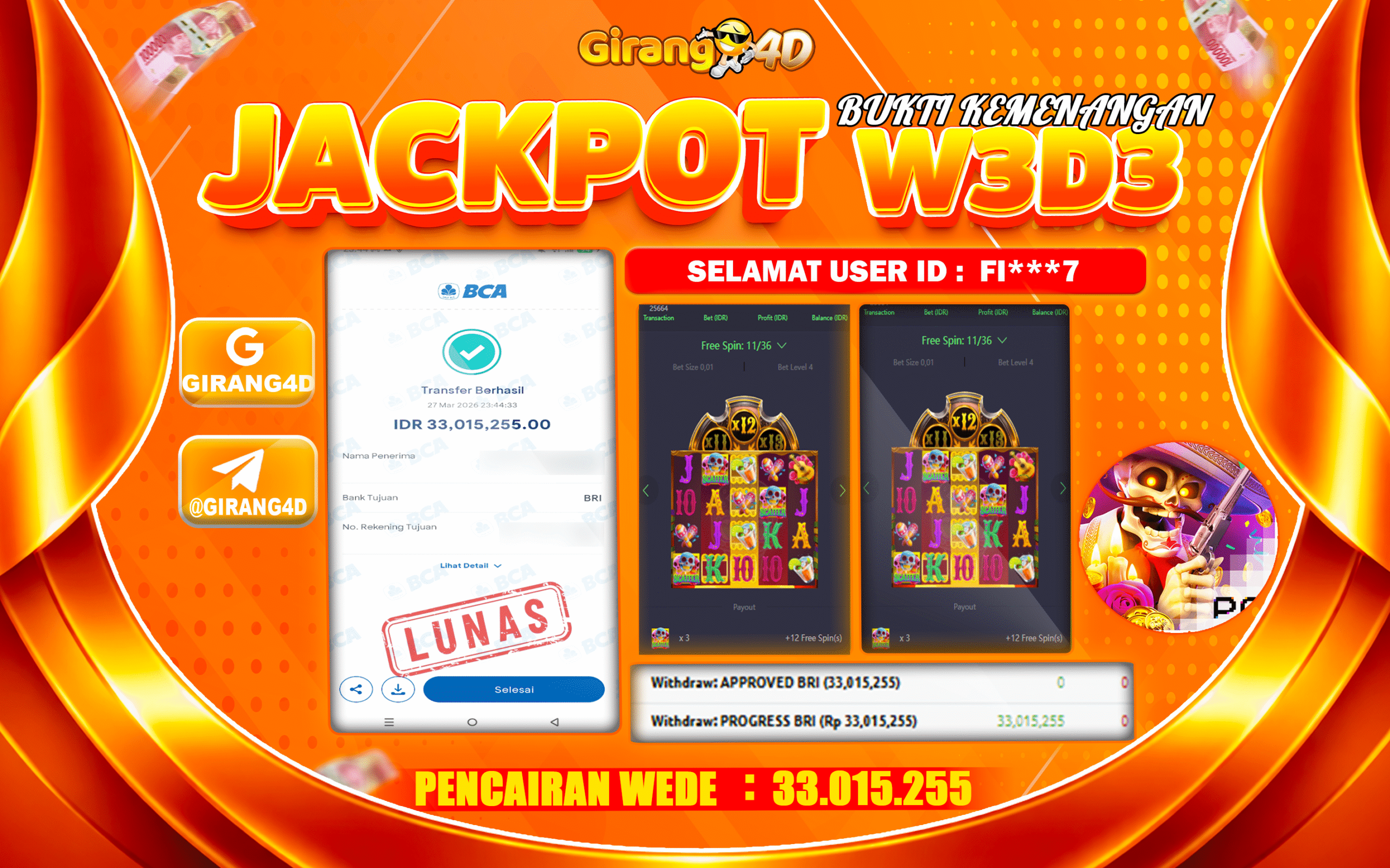 Selamat Kepada Id : FI***7 Atas Withdraw Rp. 33.015.255 Juta Hari ini. Ditunggu Withdraw Selanjutnya dan ajak juga teman temannya bergabung di GIRANG4D