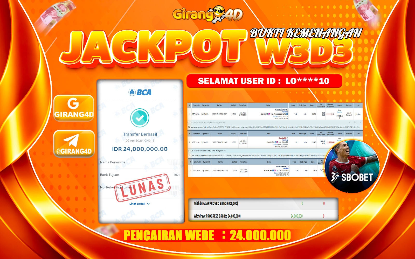 Selamat Kepada Id : Lo*****10 Atas Withdraw Rp. 24.000.000 Hari ini. Ditunggu Withdraw Selanjutnya dan ajak juga teman temannya bergabung di GIRANG4D